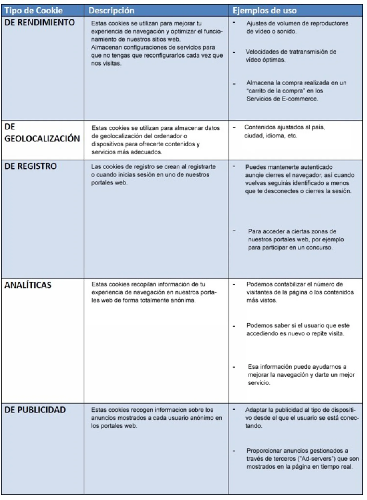 A continuación, le ofrecemos información sobre los diferentes tipos de cookies que se utilizan en el Sitio web.